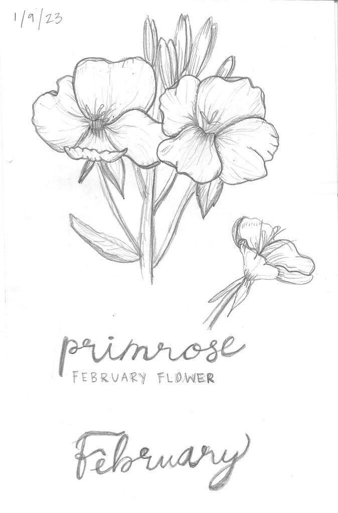 Graphite drawing of February flower, primrose