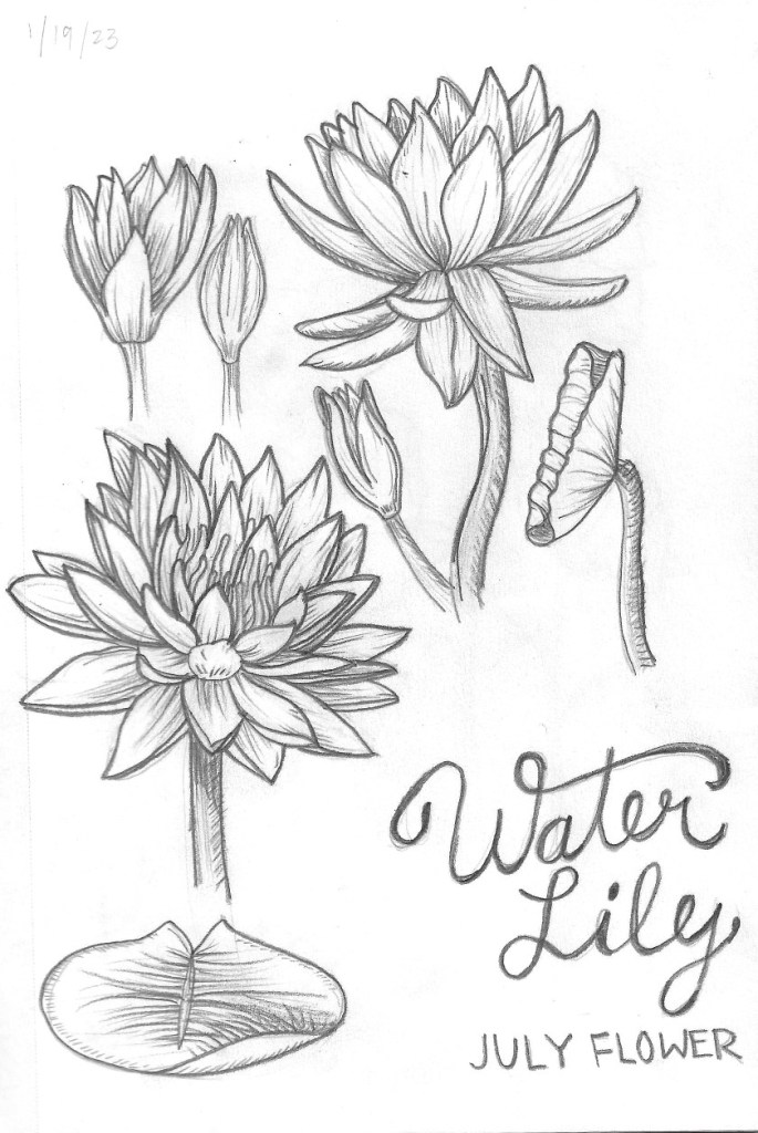 Graphite drawing of July flower, water lily