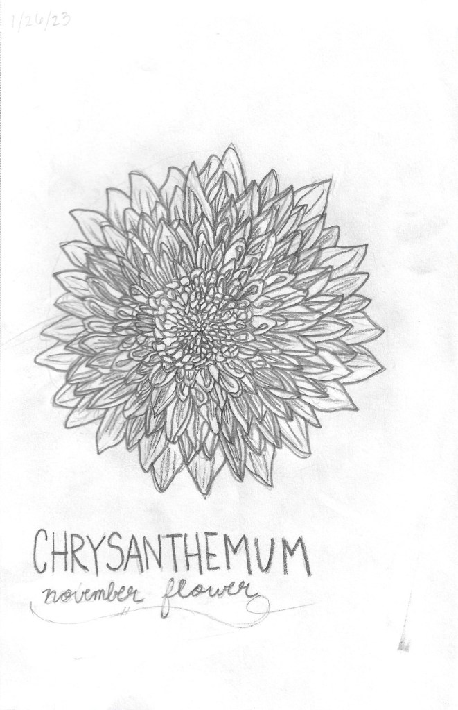 Graphite drawing of November flower, chrysanthemum