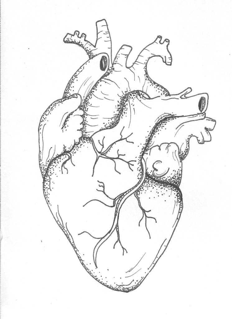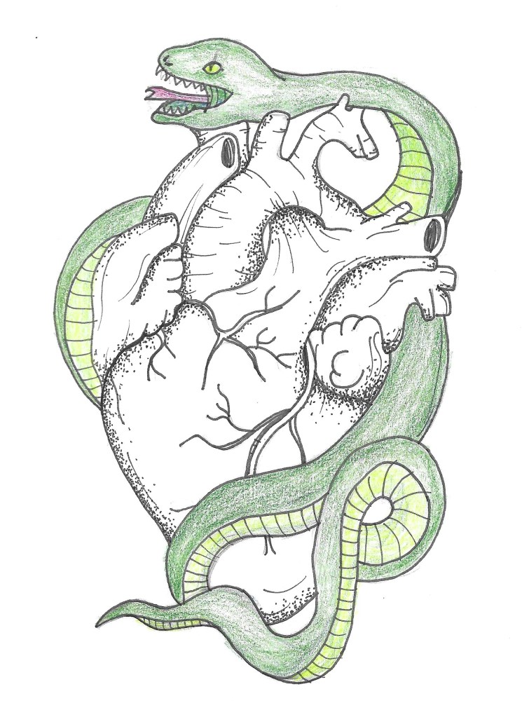 Ink and colored pencil drawing of a snake wrapped around a hear