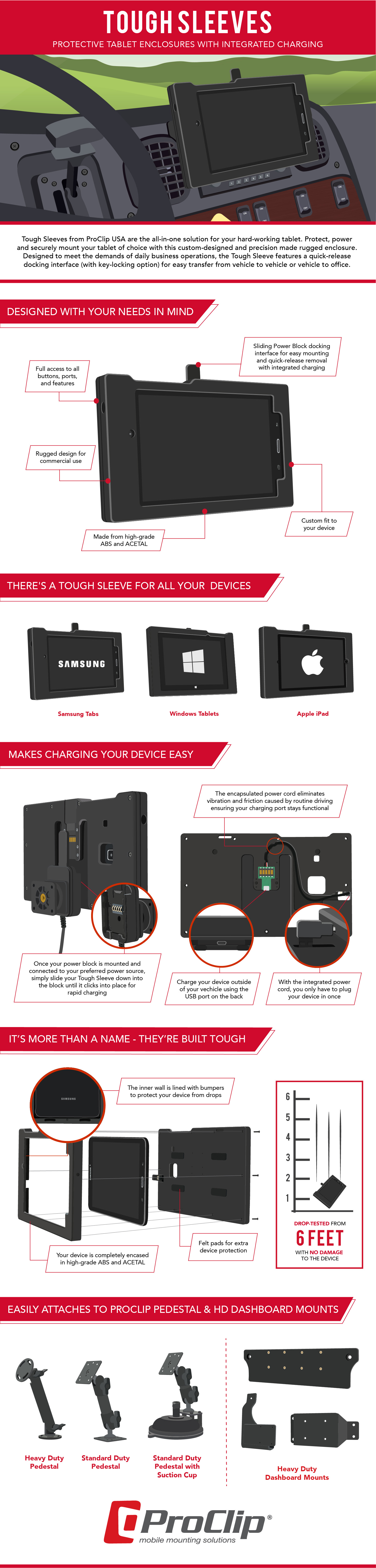 ProClip designs and manufactures two part mobile mounting solutions – mounting bases and device holders – for both consumer and commercial needs. I created three infographics for the commercial sales team to better explain more complex products and features.