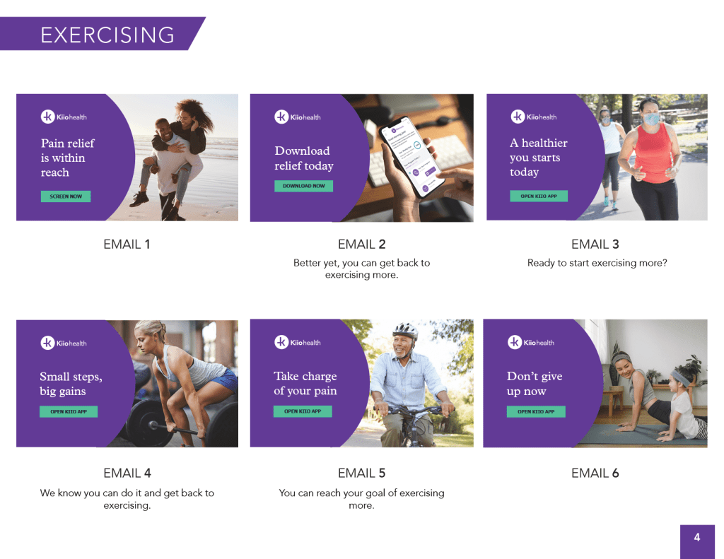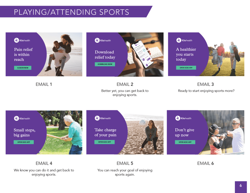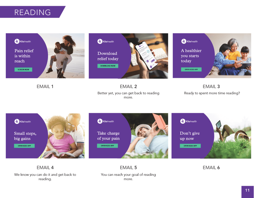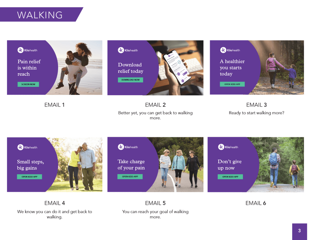 During the screening process, we ask patients to select a goal. Throughout the engagement campaign we dynamically incorporate copy and images related to the selected goal such as “Ready to get back to your goal of walking more?” with an image of people walking.
