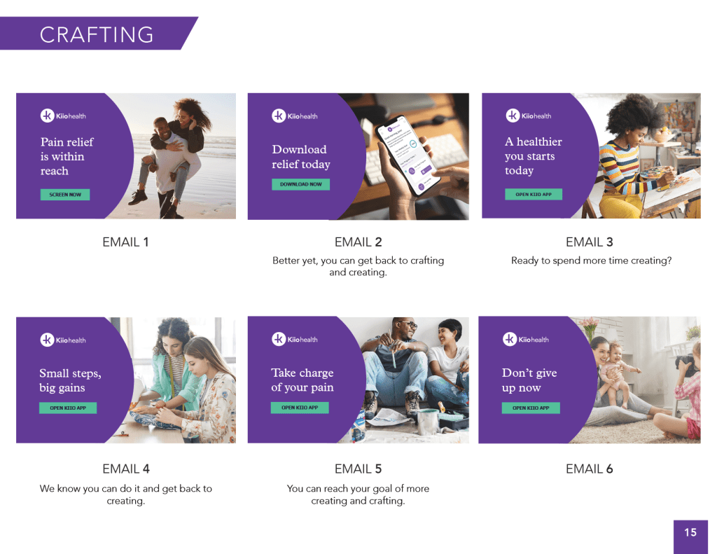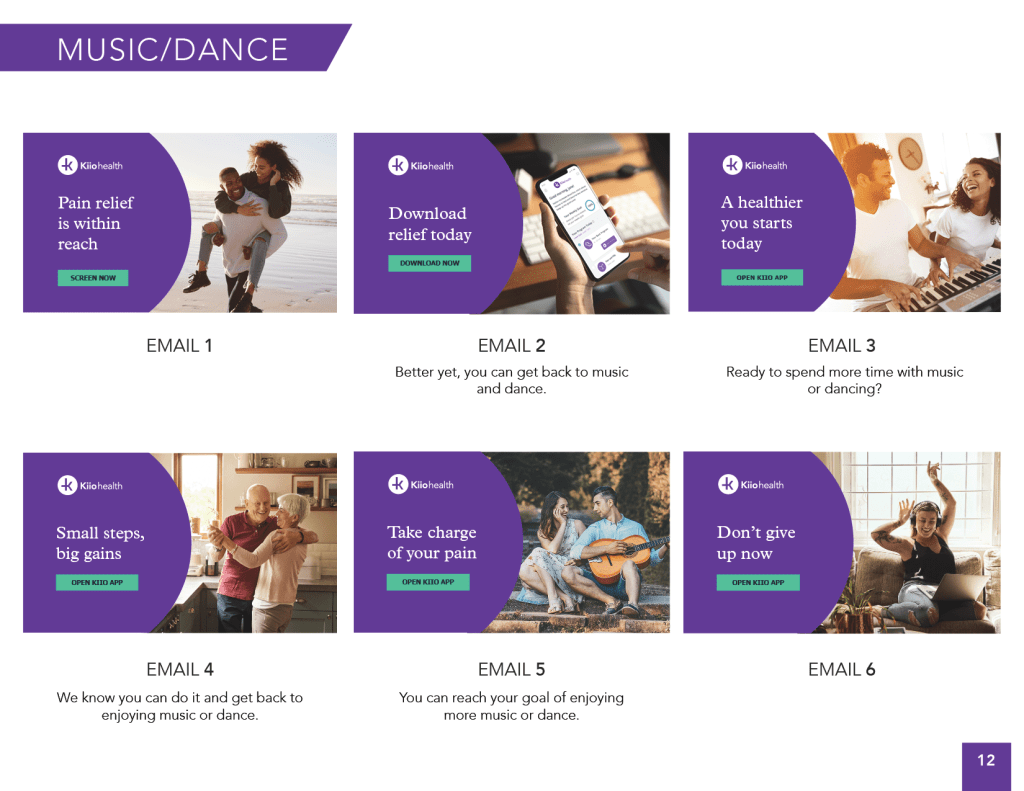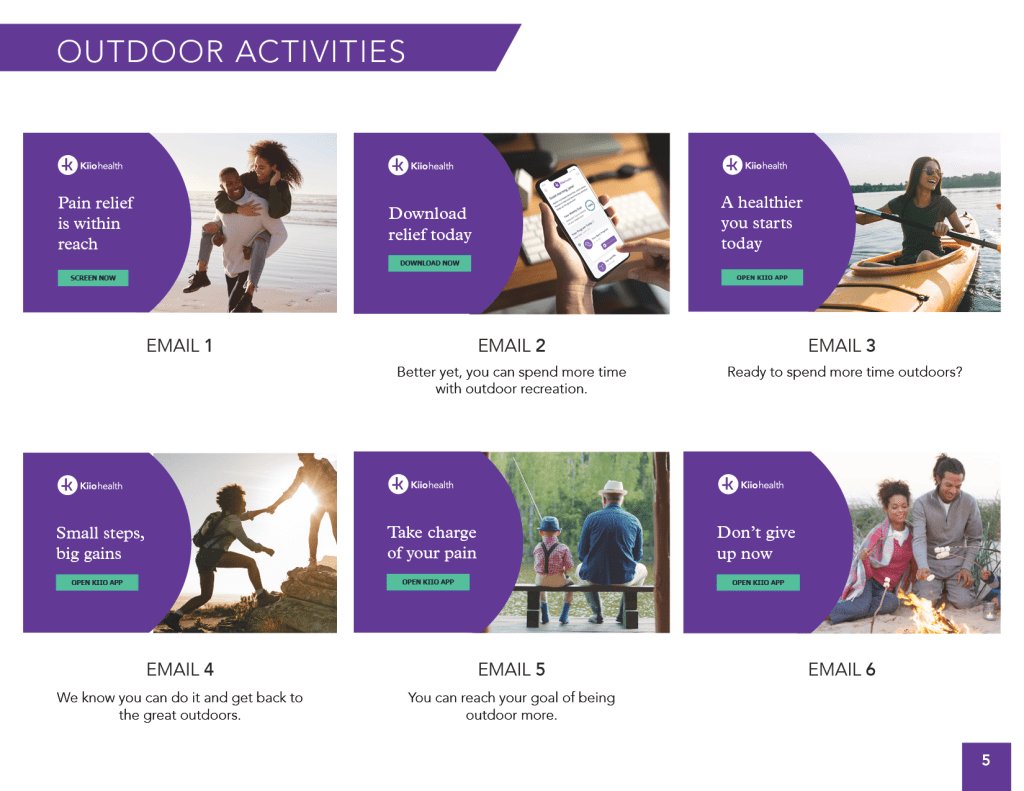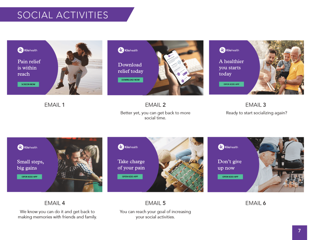 During the screening process, we ask patients to select a goal. Throughout the engagement campaign we dynamically incorporate copy and images related to the selected goal such as “Ready to get back to your goal of walking more?” with an image of people walking.